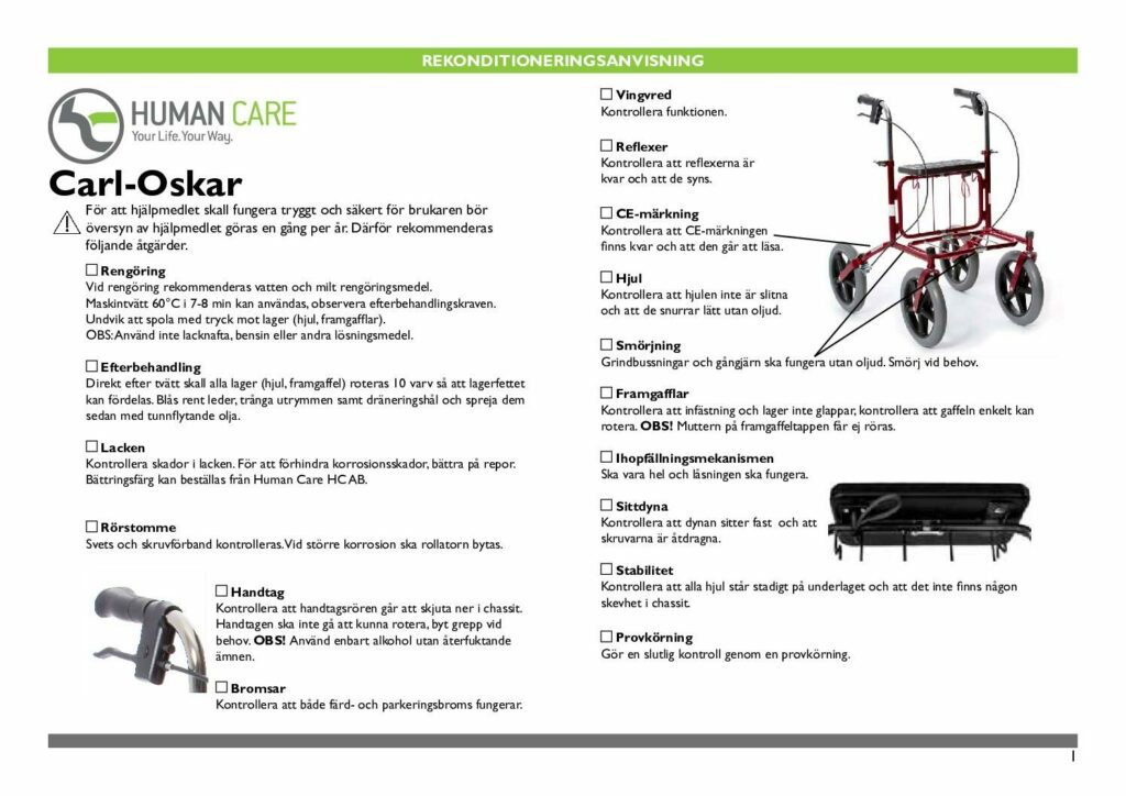Carl-Oskar är också lätt att manövrera och har ergonomiska handtag för ett bekvämt och stabilt grepp. Carl-Oskar är lätt att fälla ihop och rollatorn står stadigt och utan stöd i hopfällt läge. Carl-Oskar finns även som en förstärkt modell med en maximal brukarvikt på 275 kg.