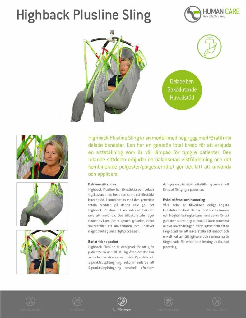 Human Cares selar i Pluslineserien är konstruerade för att lyfta tyngre patienter. Selarna har en hög viktkapacitet och storlekarna är generösa. Highback Plusline är en selmodell med hög rygg som ger ett bra stöd för hela kroppen.