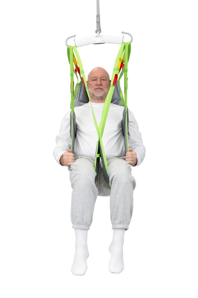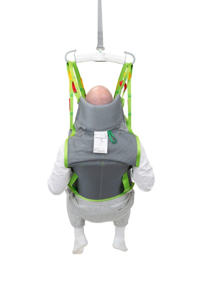 Toileting Sling high är designad med en förstärkt rygg vilket ger bra stöd, den har även vaddering under armarna för extra komfort. Lyftselens upprätta sittställning gör att förflyttning till och från toaletter blir lättare och passar patienter med svagare bål- och nack-stabilitet. För vissa patienter med lägre kroppsstabilitet rekommenderas ett midjebälte, se nedan i specifikationen för sel+bältkit. Den breda öppningen mellan bendelarna gör selens applicering snabb och enkel och möjliggör av- och påklädning under toalettbesök eller bad